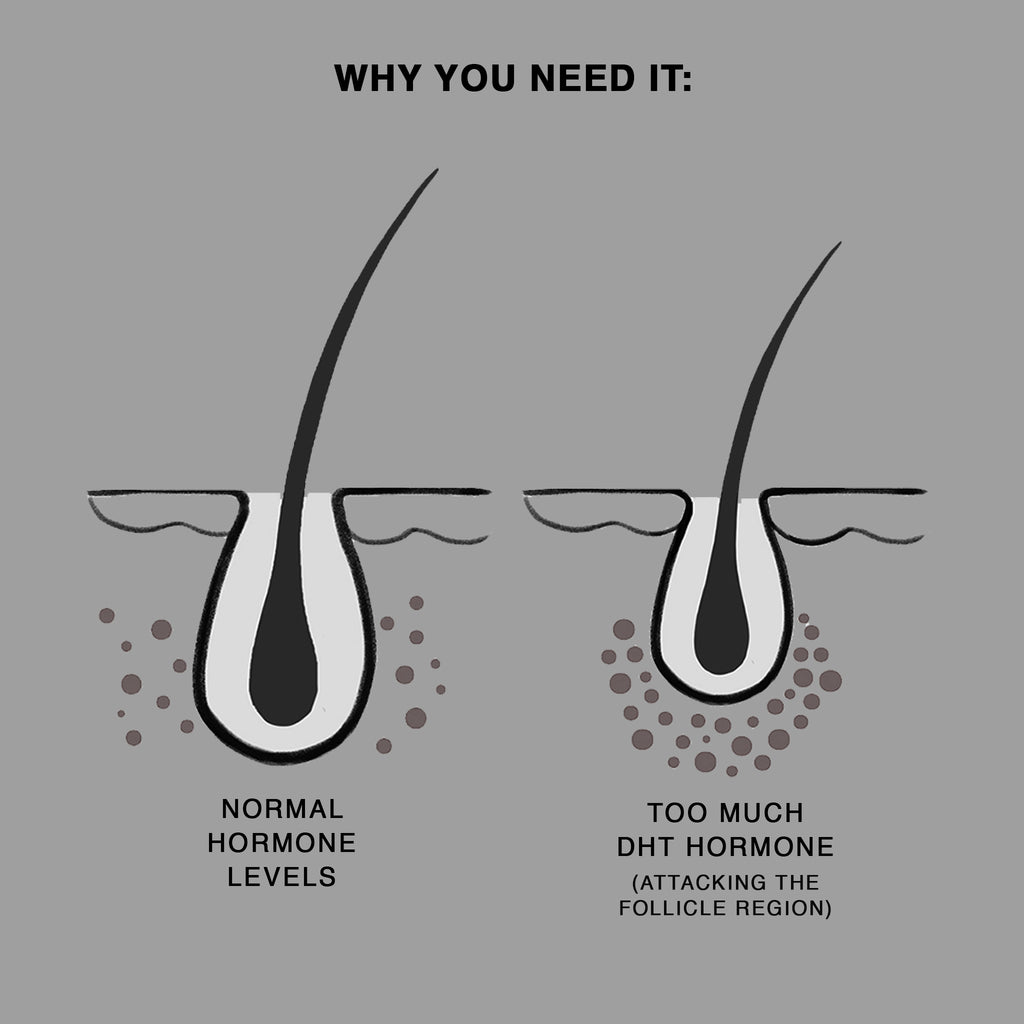 Total hair loss caused by DHT hormones, which miniaturize & minimize follicles