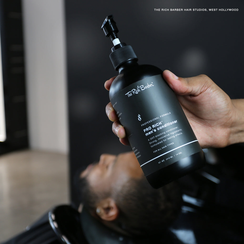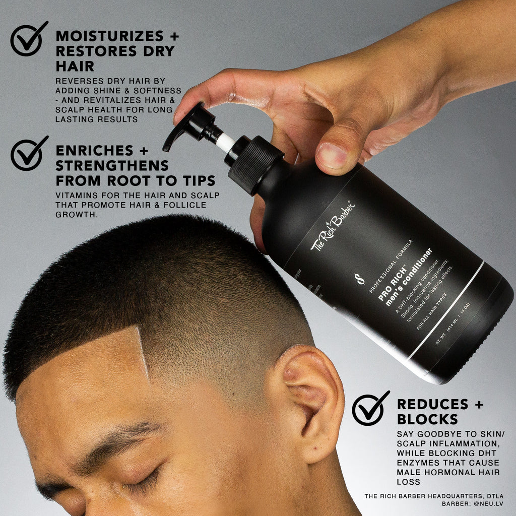 The ultimate fresh-smelling pro-hair thickening conditioner for men. The Rich Barber Pro Rich Conditioner was designed to combat male hormonal hair loss caused by DHT; while also stimulating follicle growth/strength, nourishing the scalp and reducing skin redness, promoting hair thickness by preventing breakage and adding luster and shine. Formulated with natural ingredients like Saw Palmetto, a plant-based ingredient that reverses male hormonal hair loss caused by producing too much testosterone. (See more ingredients listed in the description). Ideal for the man looking to restore his full hair health, from the scalp to the follicles to the tips. Use with the Pro Rich Men's Shampoo for maximum results.